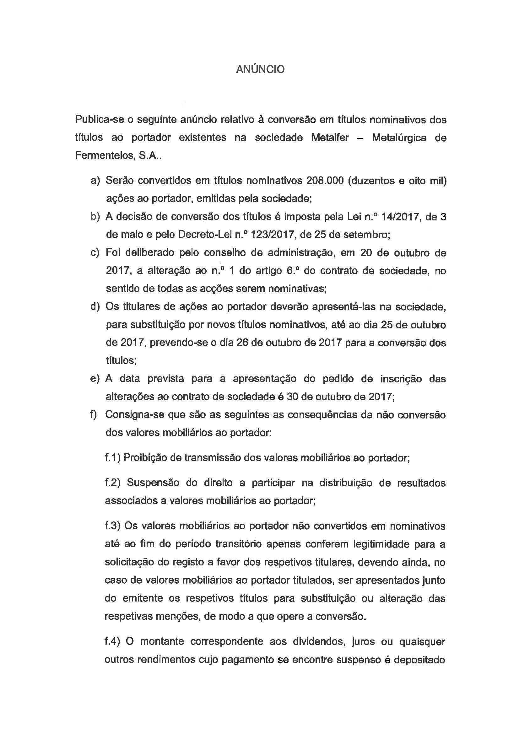 • Metalfer - Anúncio de conversão em títulos nominativo dos títulos ao portador