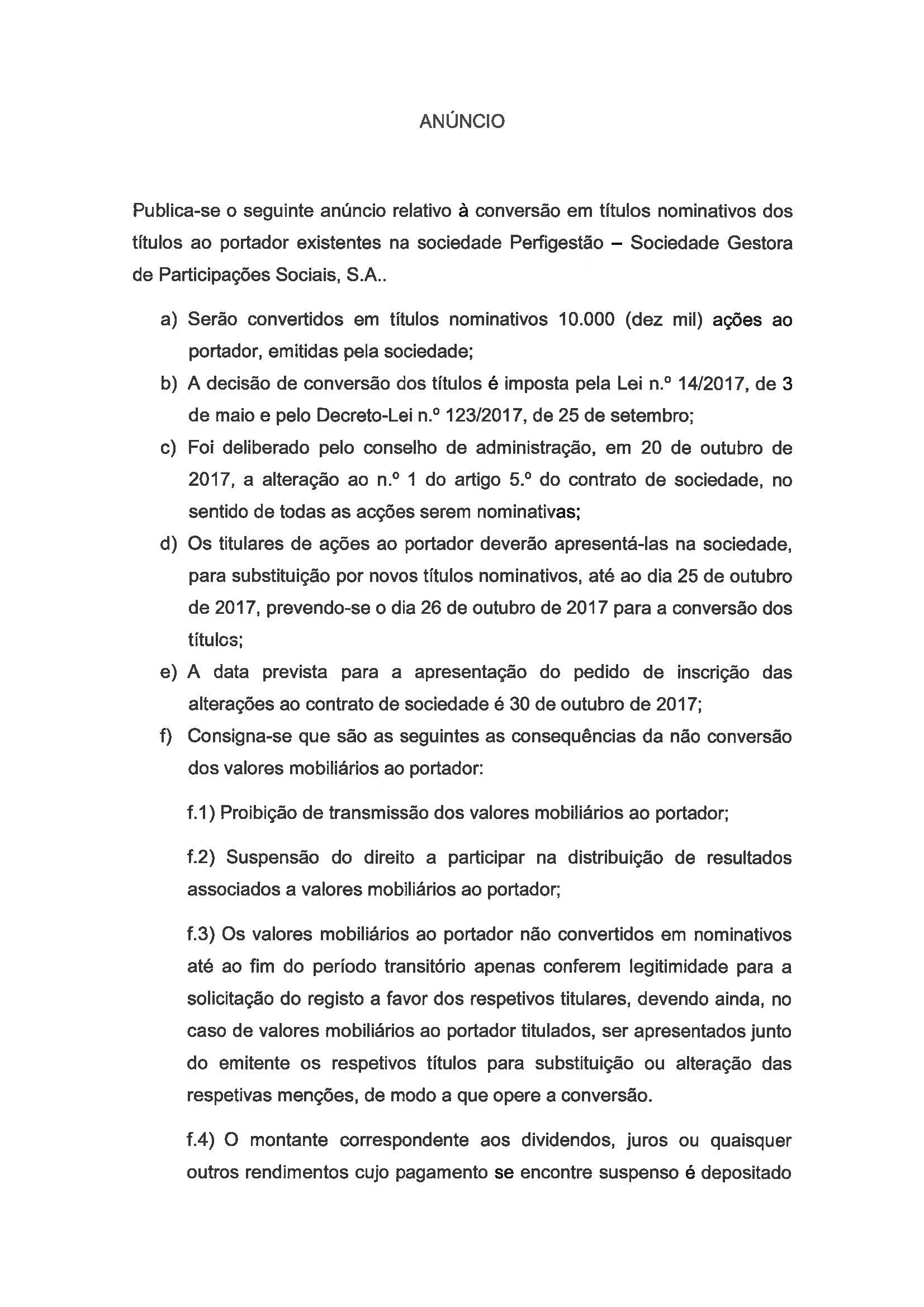 • Perfigestão - Anúncio de conversão em títulos nominativo dos títulos ao portador