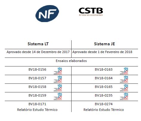 • Cerificação dos Sistemas LT e JE pelo CSTB - Centre Scientifique et Technique du Bâtiment