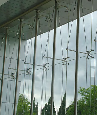 Système de mur-rideau agrafée qui se composé d'une structure en profils d'aluminium, araignées en acier inoxydable 316 et panneaux de verre trempé ou trempé-feuilleté, avec des trous pour la fixation à la structure.